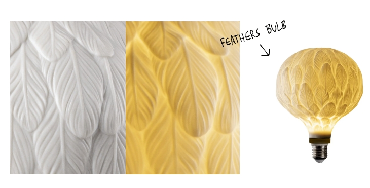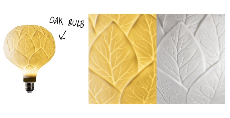Known for a multidisciplinary focus that combines design, art and nature, Marcantonio reimagines the light bulb in two surprising models: Feather Bulb and Oak Bulb. In the former, the surface is brought to life by delicate feathers; in the latter, the porcelain is decorated with the leaves of an oak tree in bas relief. When lit, the patterns come to life, with warm enveloping reflections that give any interior a special character.