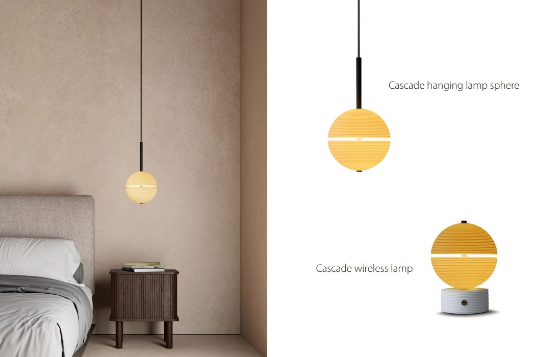 The collection features two pendant lamps and a wireless table lamp, all composed of simple geometric shapes—spherical and/or cylindrical silhouettes with horizontal and vertical lines. The pendant lamps can be customized in various configurations, allowing for unique lighting compositions tailored to each space.