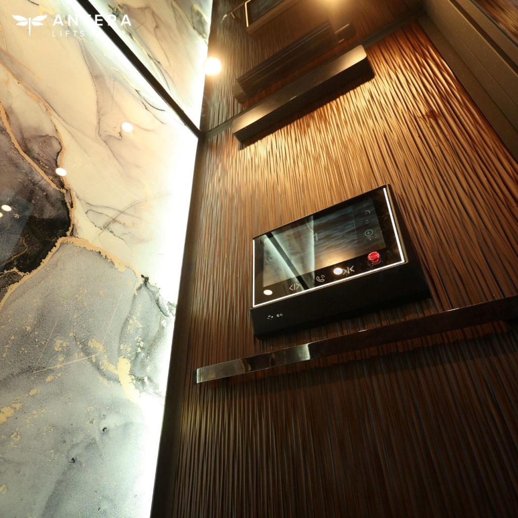 Patterns : Tenebrae (Ripple Trace)ANTERA Z90 ตัวอย่างติดตั้งจริงของลิฟต์สุดหรู โดยมีดีไซน์สี Jet Black เป็นสี Signature เฉพาะของ ANTERA Z Series ที่มี Texture เฉพาะตัวหรูหรา พร้อมผนังลิฟต์ไม้แกะสลักระดับพรีเมียม พร้อมพื้นไม้ Cork พรีเมียม
