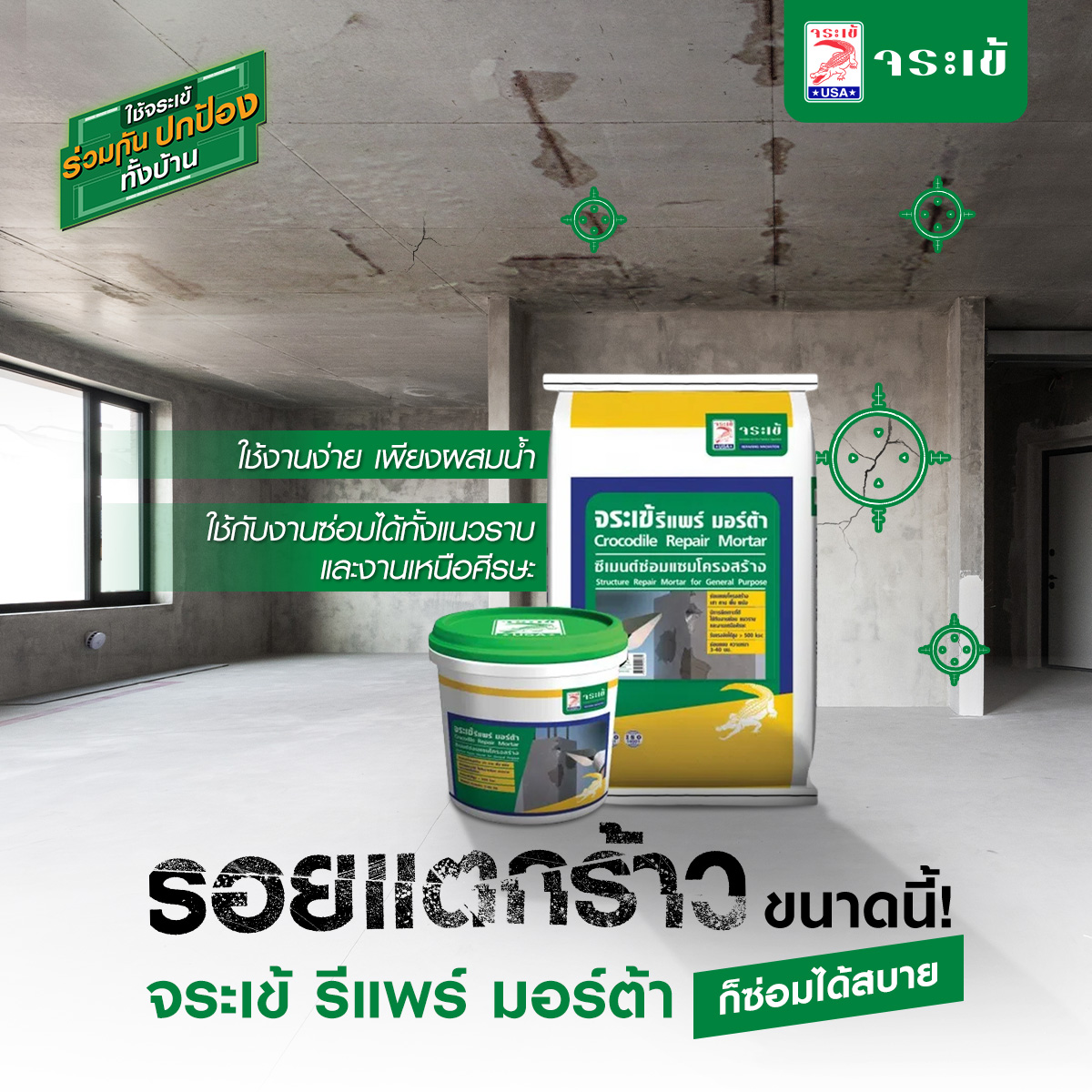 – ซ่อมแซมโครงสร้างที่แตกบิ่นเสียหาย เช่น รอยขอบมุมผนัง จมูกบันได รอยแตกร้าวของผนังคอนกรีตหรือปูนฉาบ