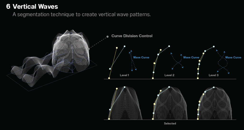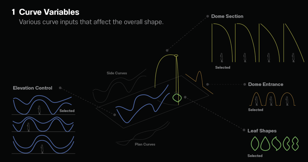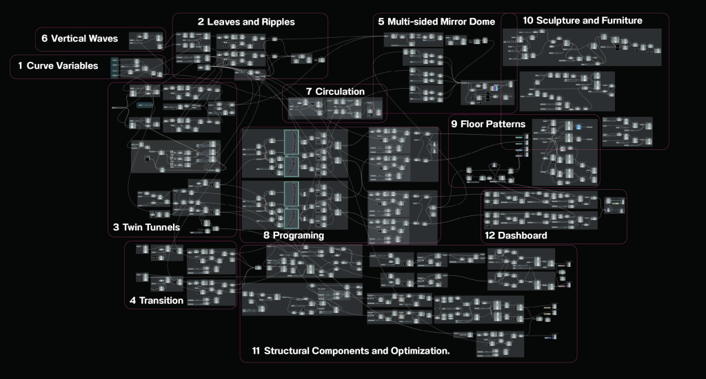 ในทุก ๆ ส่วนของพาวิลเลียน คุณต้นใช้วิธีการสร้าง “โค้ด” ที่เชื่อมทุก Element ของสถาปัตยกรรมเข้าด้วยกันให้เป็นหนึ่ง โดยรูปทรงพาวิลเลียน “ปราณสถาน” นั้น แท้จริงแล้ว เกิดมาจากการ “ป้อนเซ็ตข้อมูล” เพื่อให้โปรแกรม Generate รูปทรงออกมาแบบ 100%