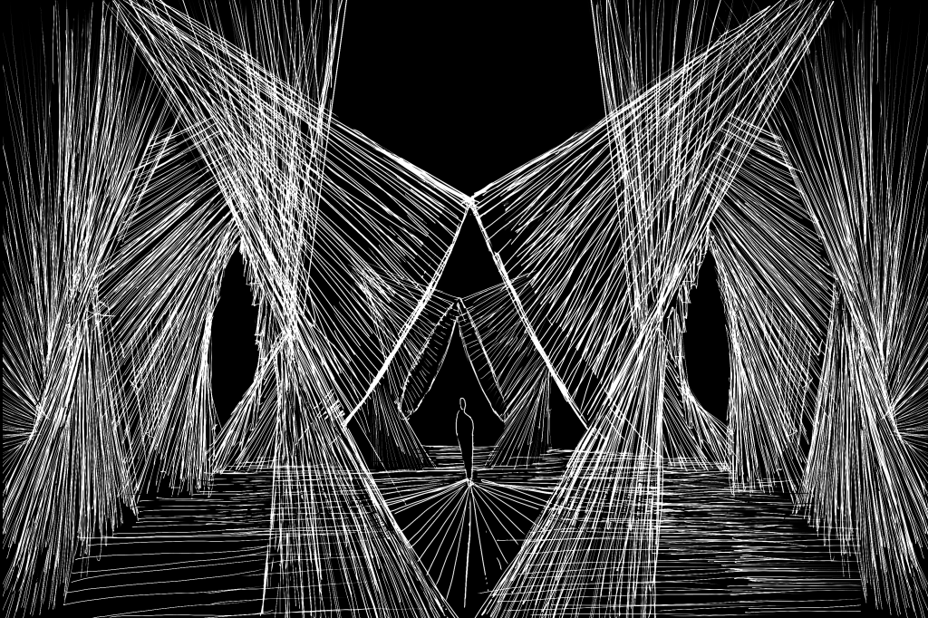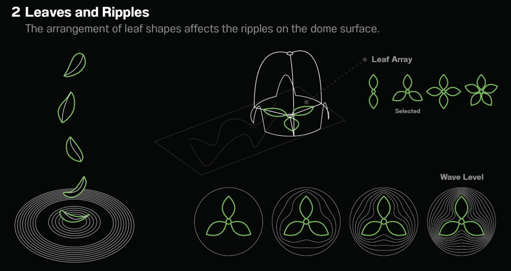ขั้นตอนการออกแบบรูปทรงของพาวิลเลียนนี้ เริ่มต้นจากการแปลค่ากราฟการหายใจ ณ ขณะของการรวมสติ เกิดเป็นรูปทรงของเส้น Curve ที่เมื่อนำมา “สะท้อน” กัน จะเกิดเป็นเส้นสายหลัก ที่จะกลายเป็นแกนของเส้นทางอุโมงค์ทางเดิน เชื่อมกันเป็นแนวยาว โดยคุณต้นมองว่า การสะท้อนรูปทรงไปมาในพาวิลเลียน ก็เปรียบเปรยได้ถึงการ “สะท้อนตัวตน ความรู้สึก และการรับรู้” ไปพร้อม ๆ กัน