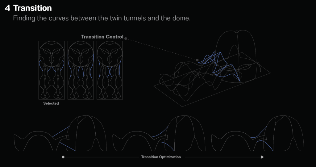 พื้นที่บริเวณอุโมงค์ จะค่อยๆ Transition เข้าสู่โดม ผ่านชิ้นส่วนทางสถาปัตยกรรมที่ถูกออกแบบมาให้เชื่อมต่อทั้งสองส่วนเข้าด้วยกันอย่างไร้รอยต่อ เปรียบดั่งการค่อยๆเข้าสู่สภาวะสงบนิ่งทางใจ