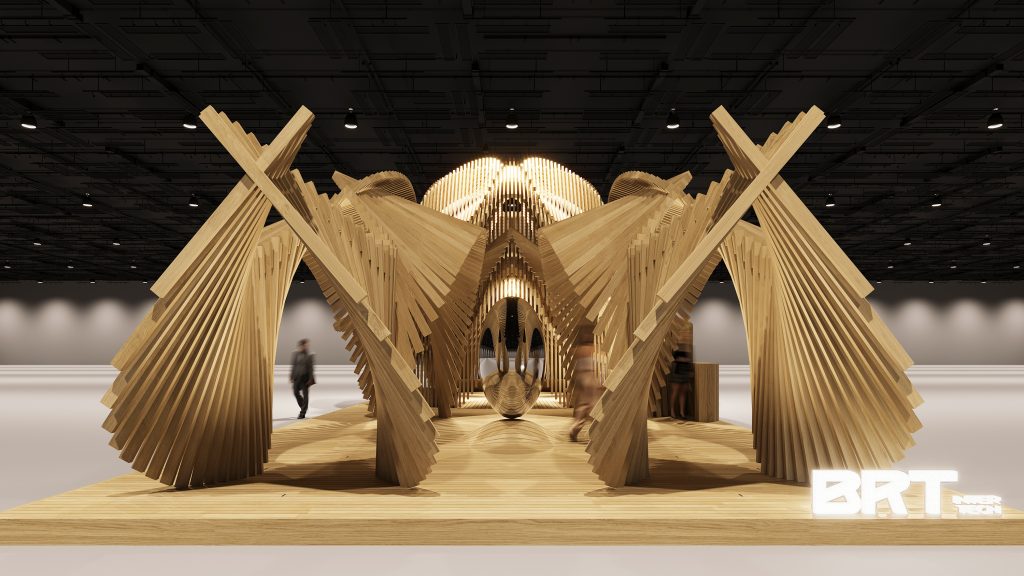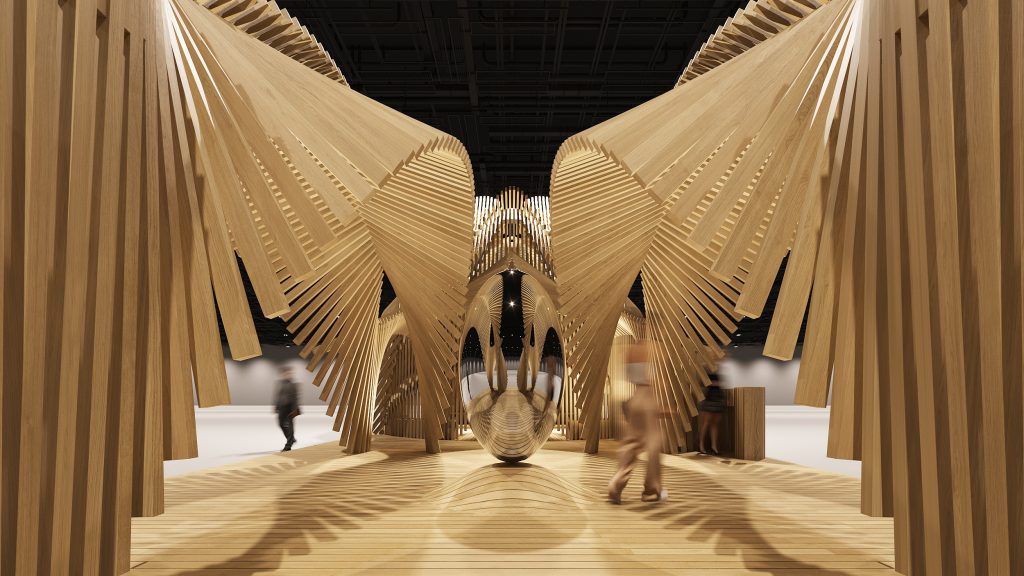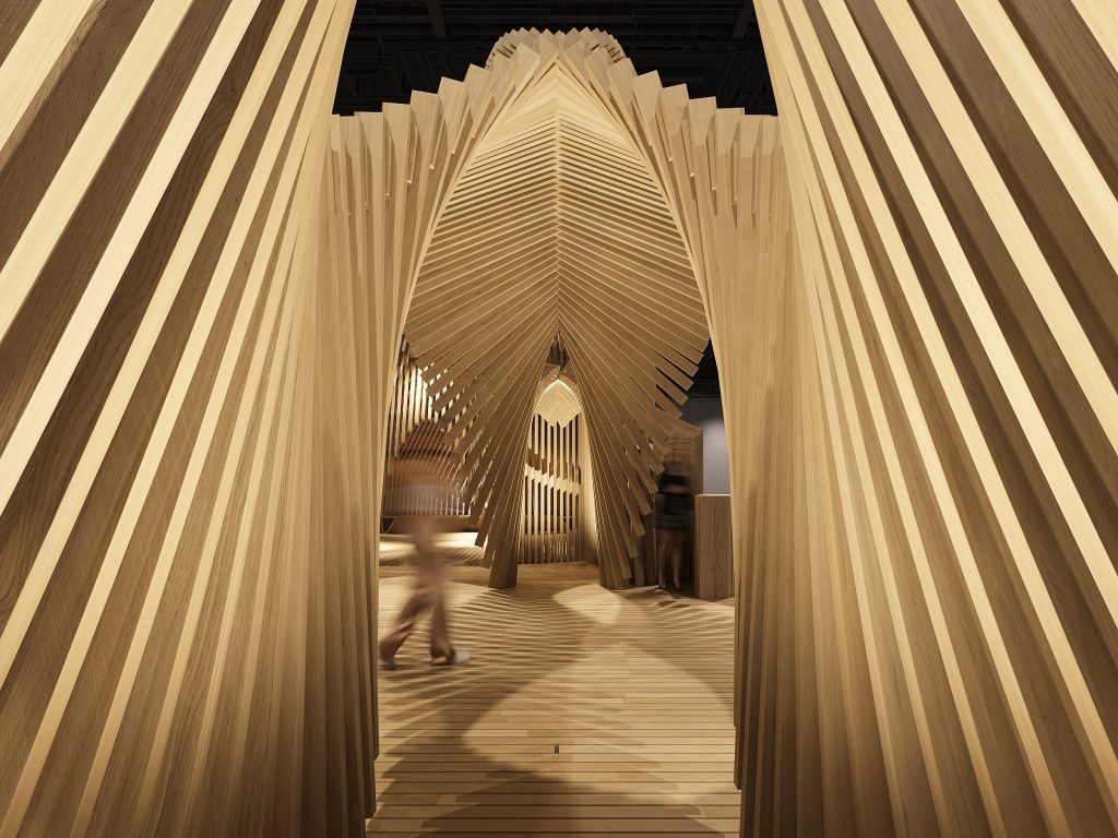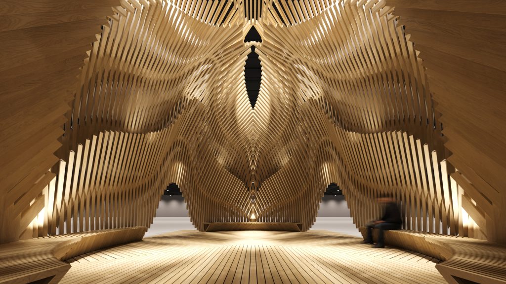 พาวิลเลียนที่หากมองจากภายนอก จะพบกับรูปทรงที่ดูลื่นไหล อ่อนช้อย แต่เมื่อเดินเข้ามาดูใกล้ๆ ความอ่อนช้อยนั้น เกิดจากการนำวัสดุไม้สังเคราะห์ SPC จากแบรนด์ INTO SPEC SMARTMATT มาเรียงกันโดยเว้นระยะห่างเท่า ๆ กัน พร้อมกับค่อย ๆ ปรับองศา ขยับแต่ละมุมอย่างละเอียดละออ สร้างความสงสัยกับเราเป็นอย่างมากว่าผลงานการออกแบบที่มีความ Advance ขนาดนี้ ผ่านวิธีคิดและใช้วิธีสร้างอย่างไร?