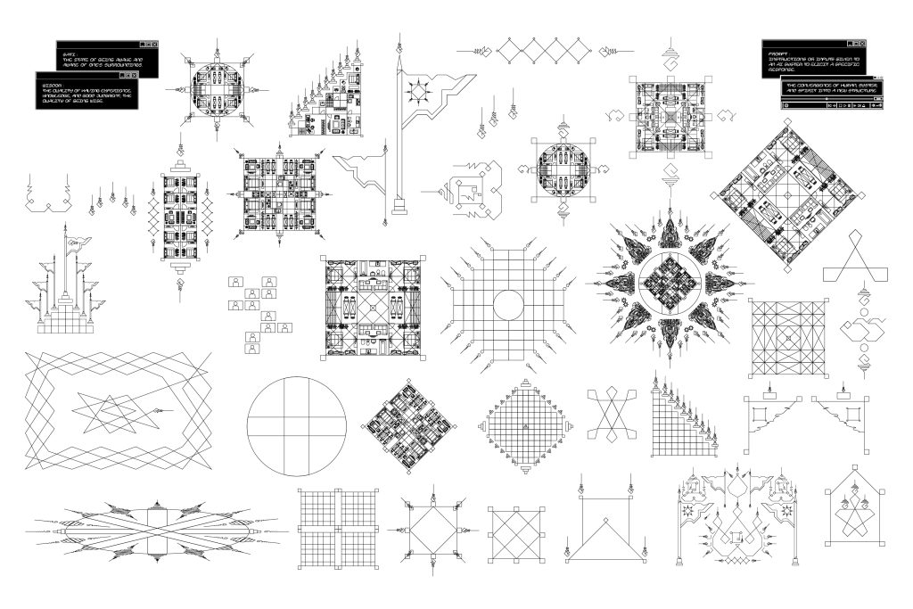 “เรามองว่ายันต์มีรูปแบบโครงสร้างใกล้เคียงกับแปลนของงานสถาปัตยกรรม ทำให้เราอยากผสานความเรื่องของความเชื่อทางจิตวิญญาณ และเรื่องทางสถาปัตยกรรมที่เป็นเชิงกายภาพเข้าด้วยกัน โดยการนำโครงสร้างอักขระยันต์มาจุดเรียงใหม่ (Reconstruct) ให้เป็น Geometry ที่คล้ายผังทางสถาปัตยกรรม (Architectural Diagram) ร่วมกับการจัดวางเลเยอร์ซ้อนทับกันระหว่าง ‘เส้นยันต์’ ‘แปลนอาคาร’ และ ‘โค้ดคอมพิวเตอร์’ เพื่อบอกว่าสถาปัตยกรรมยุคใหม่คือการรวมร่างกันของทุกสิ่ง”