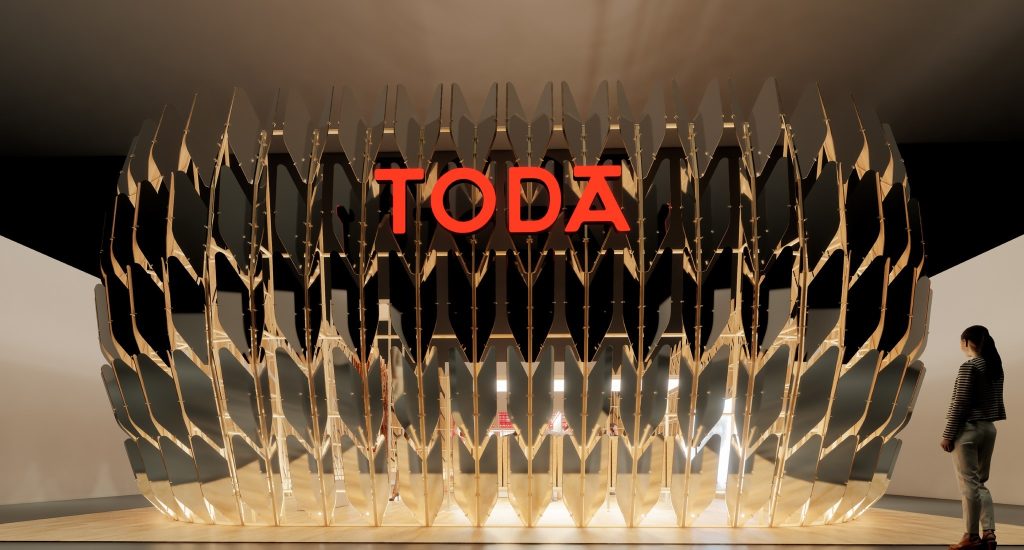 Toda ARK เป็นพาวิลเลียนจำลองภาพยานอวกาศของ TODA ในรูปแบบสิ่งมีชีวิตเชิงกล (mechanistic organism pavilion) ภายนอกห่อหุ้มด้วยกลีบผิวเสมือนโลหะ แต่เมื่อเดินเข้าสู่ภายในกลับคอนทราสต์ด้วยผิวเสมือนไม้ธรรมชาติ คล้ายอยู่ในเรือไม้ขนาดยักษ์ ตัวยานบรรทุกนวัตกรรมวัสดุที่ผ่านการคัดสรร นำมาเล่าเรื่องราวใหม่ในมิติมุมมองการวิวัฒน์ จาก 4 วัสดุธรรมชาติที่มนุษย์ใช้ในวงการก่อสร้างมายาวนาน ได้แก่ หนังสัตว์ ไม้ หิน และดิน ในรูปแบบศิลปะจัดวาง